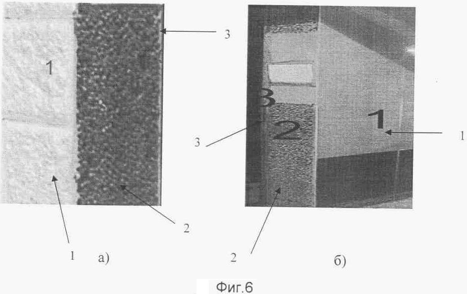 В качестве несъемной опалубки на приводимом примере (фиг.6) служат: а)плиты из архитектурного бетона 1 и цементно-стружечные плиты 3, и б) плиты из керамогранита 1 и гипсоволокнистые плиты 3. Пространство между несъемной опалубкой 2 в обоих вариантах заполняется «КАПСИМЭТом» на основе керамзитового гравия, капсулированного и омоноличенного цементным молоком.