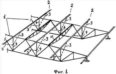 В узлах ферм покрытия, где отсутствуют стойки 4 ферм (фиг.1), прогоны 10 в покрытии могут быть выполнены бесподкосными, например, по патенту SU 2072413 C1, 6E04С 3/04 (фиг.1).