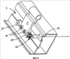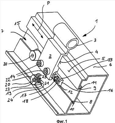 Профиль имеет С-образный в поперечном сечении профильный паз 7, который имеет поверхности 10, 11 боковых выточек, образованные двумя продолжениями 8, 9 профиля. Поверхность 10 боковой выточки паза, изображенная на чертеже внизу, образует опору для зажимной поверхности 12 крепежной пластины 13. Последняя имеет два резьбовых отверстия, невидимые на чертеже, в которые соответственно ввинчиваются зажимные винты 14, проходящие через отверстия в крепежной части 2. Крепежная часть 2 выступает за продолжение 8 профиля на стороне, противолежащей поверхности 10 боковой выточки паза, так что при затягивании зажимных винтов 14 продолжение 8 профиля зажимается между крепежной частью 2 и зажимной поверхностью 12 крепежной пластины 13, и крепежная часть после затягивания зажимных винтов 14 закрепляется на профиле 6 с силовым замыканием, которое препятствует смещению в продольном направлении профиля, показанному символически стрелкой Р.