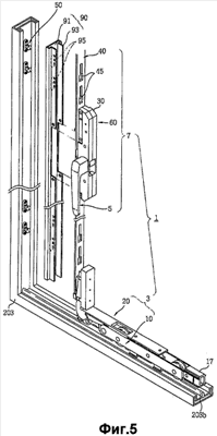 фиг. 5 – открывающее и закрывающее устройство для поднимаемых раздвижных дверей и окон, согласно одному варианту выполнения данного изобретения, в изометрической проекции;