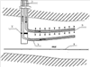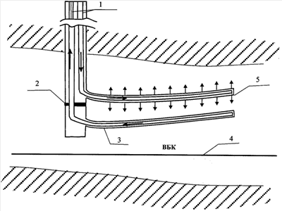 Восходящая траектория нижнего добывающего горизонтального ствола 3 этажной скважины способствует притоку пластовой жидкости от забоя к вертикальной части скважины. Стволы проводят в интервале наиболее проницаемого прослоя по направлению к купольной части залежи, причем они располагаются выше подошвы пласта вязкой нефти или битума или водобитумного контакта (ВБК) 4 на расстоянии не менее 6-7 м, увеличивающем безводный период эксплуатации скважины.