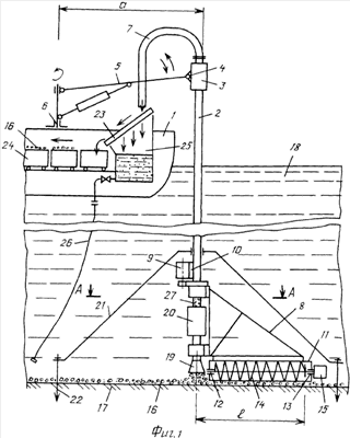 После отработки данного участка с помощью крана 6 напорный трубопровод 2 приподнимается над дном 17, а базовое судно 1 перемещается на смежный участок, на котором цикл работ производится в описанном выше порядке. Периодически или после того как все контейнеры 24 будут заполнены конкрециями 16, контейнеры с конкрециями с базового судна 1 перегружаются на транспортное судно.