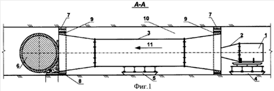 На чертежах обозначены: 1 – вентилятор местного проветривания, 2 – сопло вентилятора, 3 – эжектирующий канал в виде обечайки с раструбами на концах, 4 – рама вентилятора, 5 – рама обечайки, 6 – отсекающая заслонка, 7 – перемычки, 8 – металлические трубы или кольца, 9 – герметизация зазоров между обечайкой и перемычками, 10 – горная выработка, 11 – направление потока воздуха для частичного повторного использования, 12 – двойные двери.