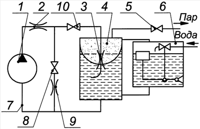 Шахтный взрывобезопасный парогенератор работает следующим образом. При включении парогенератора вентиль 8 открыт, а вентиль 10 закрыт, что обеспечивает циркуляцию воды только в нагревательном контуре высокого давления. Вода, нагнетаемая насосом 1, проходя через гидросопротивления 2 и 9, нагревается до заданной температуры. После нагрева воды открывают вентиль 10. Вода, попадая из нагревательного контура высокого давления в испаритель-сепаратор 4 с меньшим давлением, вскипает. В испарителе-сепараторе 4 за счет тангенциального направления струи воды, образованной загнутым концом трубопровода 7, подаваемой из напорной части нагревательного контура высокого давления, создается закручивание потока, что приводит к эффективному разделению пара и воды, обеспечивающему необходимое качество пара по влажности. Автоматическая подача воды в испаритель-сепаратор 4 за счет поплавкового регулятора 6, подпитывающей испаритель-сепаратор, позволяет, во-первых, избежать заполнения испарителя-сепаратора водой выше или ниже рабочего уровня, что обеспечивает стабильную подачу пара и его необходимое качество по влажности, во-вторых, – создать постоянный приток воды в нижнюю часть испарителя-сепаратора с целью снижения количества кавитационных пузырьков на входе насоса. Регулирование производительностью парогенератора и поддержание нужного режима работы производят вентилями 8 и 10.
