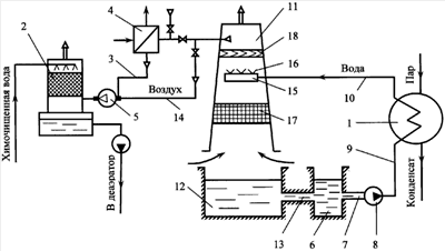 Охлажденная в градирне вода циркуляционным насосом 8 по напорному трубопроводу 9 подается в конденсатор 1 паровой турбины. В конденсаторе 1 циркуляционная вода нагревается за счет теплоты конденсации (парообразования) отработавшего в турбине пара и подается по сливному напорному трубопроводу 10 в водораспределительный лоток 15 вытяжной башни 11. Из водораспределительного лотка 15 вода поступает в разбрызгивающие сопла 16. С помощью сопел 16 поток воды разбрызгивается и в форме струй и капель падает на оросительное устройство 17, а затем стекает в виде дождя в водосборный бассейн 12. В вытяжной башне 11 градирни навстречу потоку воды движется атмосферный воздух. В процессе непосредственного контакта теплоносителей осуществляется тепло- и массообмен между водой и воздухом, при этом вода охлаждается, а воздух подогревается и насыщается водяными парами. Затем воздух проходит водоуловитель 18, где из него отделяется капельная влага, и через вытяжную башню 11 градирни отводится в атмосферу.