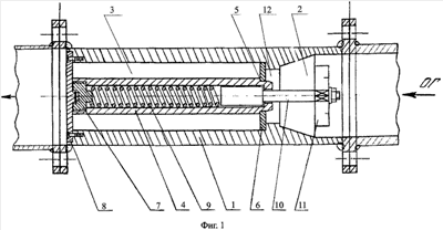 Клапан рециркуляции отработавших газов (ОГ) работает следующим образом: при запуске двигателя и работе на малых нагрузках клапан рециркуляции ОГ открыт полностью на заданное процентное содержание рециркулируемых ОГ, которые регулируется разницей диаметров поршня 11 и нижнего основания конусной части впускной полости 2 корпуса 1. В процессе работы двигателя часть ОГ через выпускной трубопровод поступают в впускную полость 2. Далее ОГ под давлением проходят через: сечение между корпусом 1 и поршнем 11, отверстия в перегородке 6, выпускную полость 3, отверстия в металлической пластине 8, и по мере прохождения ОГ направляются во впускной трубопровод системы питания двигателя. По мере того как двигатель будет набирать мощность, поршень 11 под действием давления ОГ будет прикрывать впускную полость 2. На максимальных нагрузках поршень 11 под действием давления ОГ полностью перекроет подачу ОГ во впускной трубопровод системы питания двигателя.