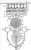 Средняя часть чертежа – солнечный спиральный нагреватель. Солнечный спиральный нагреватель представляет собой трубу 11, свитую в спираль в одной плоскости, покрашенную черной краской для нагрева в ней рабочего тела солнечной лучистой энергией. В спиральный солнечный нагреватель сжатый воздух (рабочее тело) поступает по трубе 12. Труба 14 служит для подачи сжатого и нагретого воздуха (рабочего тела) в трубу спирального нагревателя от продуктов сгорания твердого топлива в печи. Продукты сгорания выводят в атмосферу через трубу 15. Для запуска станции в работу имеются баллоны со сжатым воздухом 16, который поступает в систему через краны открытия баллонов 17. В туннель солнечного спирального нагревателя 13 продукты сгорания твердого топлива подают по трубе 18 из печи 19 от сжигания каменного угля. Через краны 20 продукты сжигания подают из печи в спиральный нагреватель. Печь 21 служит для сжигания торфа, древесины и угля, которые загружают в печь через двери 22. По трубе 23 продукты сгорания твердого топлива из печи подают в туннель 25 спирального нагревателя. 24 – камера поступления продуктов сгорания топлива в спиральный нагреватель.