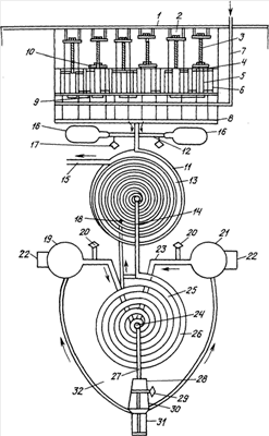 Нижняя часть чертежа – спиральный нагреватель от продуктов сгорания угля. Труба 26, свернутая в спираль, образует спиральный нагреватель. Между спиралями нагревателя проходит туннель 25. Для подачи рабочего тела в камеру служит труба 27. На случай отсутствия твердого топлива имеется камера 28 перед турбиной, в которую подается природный газ. В турбину рабочее тело подают через заслонку 29 с калиброванными отверстиями. Для превращения давления и тепла рабочего тела в механическую энергию служит рабочая турбина 30. Электрогенератор турбины 31 преобразует механическую энергию турбины в электрическую. По трубе 32 в печь подают мятое рабочее тело для увеличения теплотворной способности твердого топлива за счет положительной температуры рабочего тела.