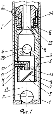 Также при этом чистая нефть по продольному каналу 28 и радиальному 30 поступает в среднею надпоршневую полость А. По мере перемещения поршня 22 вниз под действием силы упругости пружины сжатия 24 пластовая жидкость из подпоршневой полости Б вытесняется по радиальному каналу 25 в полость плунжера 3. При ходе плунжера 3 вверх нагнетательный клапан 4 закрывается, а всасывающий клапан 2 открывается и пластовая жидкость заполняет подплунжерную полость Д цилиндра 1. При этом плунжер 3 поднимает вверх столб пластовой жидкости. Статическое давление этой жидкости передается по радиальному каналу 25 переходника 19 в подпоршневую полость Б, а в средней надпоршневой полости А создается разрежение. Оно передается из полости Д по каналу 12 патрубка 11, продольному каналу 28 и радиальному каналу 30. В результате того, что давление пластовой жидкости в подпоршневой полости Б больше, чем давление в средней надпоршневой полости А, поршень 22 поднимается вверх, сжимая пружину сжатия 24. При этом чистая нефть из полости А поступает (высасывается) по радиальному каналу 30, продольному 28 и каналу 12 в полость Д, рсположенную под плунжером 3. Также при этом верхняя кольцевая часть 37 поршня 22 вытесняет чистую нефть с верхней надпоршневой полости Г по радиальному каналу 26 в кольцевую выточку 27 плунжера 3. Перемещению чистой нефти из полости Г по радиальному каналу 29 в продольный канал 28 препятствует шарик 33. Он под собственным весом, а также из-за давления в полости Г плотно прилегает к конической поверхности 32 и закрывает канал 28.