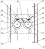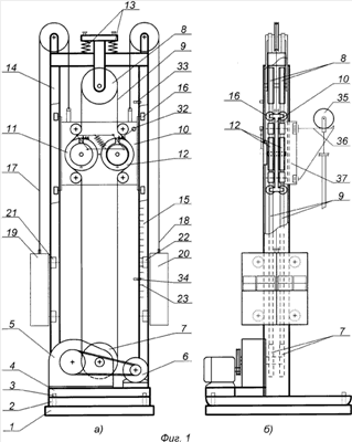 На фиг.3 показан момент, при котором шкивы 11 заторможены, а шкивы 12 расторможены и вращаются, каретка 10 движется вверх. Дойдя до ограничителя 33, рычаг 32 переключает пантограф 30 в противоположное устойчивое положение и фиксирует его с помощью пружины 31. Происходит одновременное растормаживание шкива 11 и затормаживание шкива 12. При этом шкив 11 начинает вращаться, а шкив 12 не вращается и каретка 10 продолжает движение уже в обратном направлении. Дойдя до нижнего ограничителя 34, рычаг 32 переключает пантограф 30 в противоположное устойчивое положение и фиксирует его с помощью пружины 31 и далее процесс продолжается. Возможные динамические нагрузки компенсируются с помощью пружин 13, которые одновременно обеспечивают необходимое натяжение гибких непрерывных звеньев 9. Изменяя расстояние между ограничителями 33 и 34, перемещая их по шкале делений 23, можно установить необходимую длину хода колонны штанг. Самоориентирующаяся подвеска колонны штанг позволяет автоматически выдерживать необходимое направление полированного штока, тем самым снижая трение и износ элементов.