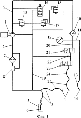 Для контроля работы сигнализатора минимально допустимого давления в гидросистеме проверяемого объекта регулируемый гидравлический клапан 17 низкого давления вручную плавно открывают, снижая этим самым давление в гидросистеме проверяемого объекта, и по манометру 12 визуально определяют давление, при котором срабатывает сигнализатор падения давления в гидросистеме проверяемого объекта ниже допустимого.