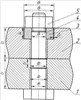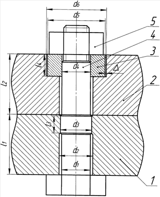 При сборке соединения часть болта диаметром d4 свободно проходит через отверстие d3 детали 1 и входит в отверстие цилиндрической втулки 3 под посадку без зазора, одновременно участок болта с пояском диаметром d3 плотно входит в отверстие детали 1 на участке l3. Затем производится затяг болтов на заданное усилие натяга, обеспечивающее упругое вдавливание головки болтов 4 и гаек 5 в детали 1 и 3.