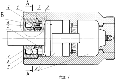 Амортизатор показан на фиг.1, на фиг.2 показан разрез А-А с фиг.1, на фиг.3 показан выносной элемент Б с фиг.1, где 1 – корпус с крышками, 2 – шток, 3 – подвижное уплотнение штока, 4 – дополнительное уплотнение штока, 5 – дополнительные полости, 6 – упругие элементы, 7 – обратный клапан, 8 – полость корпуса.