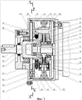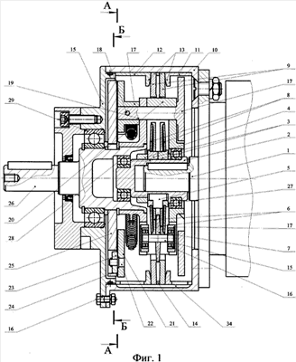 Автоматическая бесступенчатая передача содержит ведущий (быстроходный) центральный вал 1 (фиг.1), в данном случае являющийся валом электромотора, объединенного с вариатором в один блок – мотор-вариатор. На валу 1 посажена с возможностью ограниченного осевого перемещения и передачи крутящего момента (на шпонке) втулка 2, на которой с помощью упоров 3 и гайки 4, а также фасонной шпонки 5 посажены центральные внутренние фрикционные диски 6, прижатые к промежуточным фрикционным дискам 7 с помощью тарельчатых пружин 8, упирающихся в борта упоров 3, причем диски 6 посажены на втулке 2 с возможностью их осевого перемещения в пределах, допустимых осевой упругостью пружин 8. Внешние центральные фрикционные диски 9, играющие одновременно роль силовых элементов осевого действия – дисковых пружин, контактирующие с промежуточными фрикционными дисками 7, посажены в корпусе 10 с помощью втулок 11 и 12 с упорами 13 на них, а между дисками 9 может находиться замкнутое или незамкнутое кольцо 14, определяющее осевое расстояние между основаниями дисков 9, однако наличие кольца 14 возможно, но не обязательно. Левая часть (фиг.1) втулки 12 контактирует с торцевой крышкой 15 корпуса 10, и таким образом, основания дисков 9 зажаты между упорами 13 втулок 11 и 12, в свою очередь зажатыми между правым торцом корпуса 10 и крышкой 15, прижимаемой к корпусу 10 болтами 16.