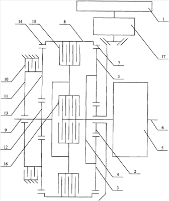 Перед включением режима рекуперации/разгона производится выбор начальной передачи коробки передач, обеспечивающей попадание в номинальный диапазон частоты вращения двигателя. Т.к. с двигателем связано неизменным для каждого режима передаточным отношением центральное колесо 7, тахометр (на схеме не показан), определяющий частоту свободного вращения данного колеса в момент непосредственно перед рекуперацией/разгоном, вне зависимости от соотношения частот вращения маховика и выходного вала позволяет однозначно выбрать начальное передаточное число коробки передач. В дальнейшем, по мере замедления/ускорения выходного вала происходит последовательное увеличение/уменьшение передаточных чисел коробки передач 5 исходя из условия работы двигателя в номинальном диапазоне частот. Если рекуператор оборудовать дополнительной коробкой передач 17, связанной с маховиком, того же эффекта можно достичь, уменьшая/увеличивая передаточные числа данной коробки, при этом неизменное передаточное число коробки 5 обеспечит относительно постоянный (в зависимости от скоростной характеристики двигателя) момент замедления/ускорения на выходном валу. Коробка передач 17 позволяет поддерживать частоту вращения центрального колеса 2 в оптимальном диапазоне. Использование коробки 17 является также альтернативой увеличению количества ступеней стандартной коробки 5. Интенсивность замедления/ускорения определяется регулирующим органом двигателя, например дроссельной заслонкой.