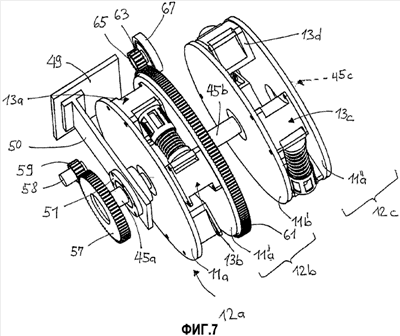 На фиг.7 изображен пример выполнения, в котором между собой взаимодействуют несколько элементов 12а, 12b и т.д. Элемент 12а жестко установлен на первой оси 45а, элемент 12b – на второй оси 45b, независимой от первой, а элемент 12 с – на третьей независимой оси 45с (на фиг.7 не показана). Для наглядности определенные детали, такие как ограничитель 51 обратного хода и рама 49 с кронштейном 50 для закрепления вала 45b, на чертеже опущены (фиг.8). Если через приводимое приводным валом 58 приводное зубчатое колесо 59 и зубчатое колесо 57 на ось 45а и тем самым на элемент 12а передается импульс, то этот импульс практически полностью передается пружинами 15а на элемент 12b, а с него – на элемент 12с (показан только суппорт 11а” элемента 12с). Таким образом, однажды переданный на устройство импульс последовательно движется от одного элемента к следующему элементу до тех пор, пока он не дойдет до конца установленных друг за другом элементов 12а, 12b и т.д. В принципе, возможно, чтобы импульс затем вернулся к месту, в котором он подавался к устройству. Для этой цели на держателях 13а, 13b и т.д. соседних элементов 12a, 12b и т.д. может быть предусмотрено по одному пружинящему средству 15a, 15b и т.д. Такое устройство может быть, в принципе, использовано для аккумулирования за определенное время кинетической энергии.