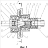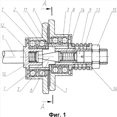 Внутри ведущего вала 5 в глухом осевом отверстии, имеющем со стороны открытого конца (справа по фиг.1) резьбу, находится разжимной механизм, содержащий толкатели 6, конусообразный кулачок 7, рабочую пружину 8 и винт 9 для сжатия рабочей пружины. В состав разжимного механизма входит также возвратная пружина 10, установленная между кулачком 7 и торцом отверстия ведущего вала (слева от кулачка 7 по фиг.1).