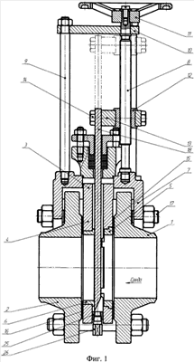 Устройство работает следующим образом. В состоянии «открыто» шибер 4 находится в верхнем положении, и рабочая среда свободно проходит через задвижку. Поворотом маховика 11 и винта управления шибером 8, связанного с гайкой 12, которая закреплена в корпусе планки 13, шиберу 18 сообщается поступательное движение вниз. При этом шибер 18 перекрывает путь рабочей среды, занимая положение между седлами 5 и 6, которые закреплены в корпусах седел 3 и 4. Сам винт управления шибером 8 одним концом закреплен в вилке 7, а другим концом – в портале 10, который с помощью трех стоек 9 также крепится к вилке 7. Вилка 7 посредством шпилек 17 соединяет в единый корпус входной 1 и выходной 2 присоединительные фланцы, корпуса седел 3 и 4, а также эластичные прокладки 15 и 16.