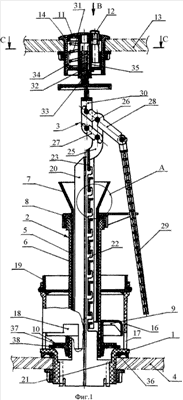 Закрепленный на нижнем конце наружной трубы 5 запорный элемент 10 выполнен в виде охватывающего наружную трубу 5 опорного диска 37, на нижней поверхности которого выполнен кольцевой выступ, а под опорным диском 37 с упором в последний расположен надетый на наружную трубу 5 и зафиксированный относительно нее эластичный клапан 38, включающий плоскую дискообразную часть 39 и цилиндрическую часть с выполненными на ее внутренней поверхности и расположенными друг под другом двумя кольцевыми выступами, причем с помощью верхнего выступа фиксируют эластичный клапан 38 относительно наружной трубы 5 путем его размещения в выполненной на наружной поверхности наружной трубы 5 кольцевой канавке, а с помощью нижнего кольцевого выступа с треугольным поперечным сечением герметизируют пространство между наружной трубой 5 и эластичным клапаном 38 в месте его установки на наружной трубе 5, при этом путем взаимодействия кольцевого выступа опорного диска 37 и плоской дискообразной части эластичного клапана 38 формируют конусообразную форму дискообразной части эластичного клапана 38.