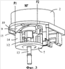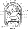 Механизм преобразования крутящего момента (фиг.3, 4) состоит из неподвижного кулачка 6 и толкателя 7 (фиг.3). При этом неподвижный кулачок 6 включает пластину основания 8 и выполнен с профилем 9, который сформирован торцевой поверхностью цилиндрической стенки 10, выполненной заодно с пластиной основания 8. Профиль 9 разделен на четыре попеременно поднимающиеся и опускающиеся плоскости, причем длина дуги каждой из четырех частей равна 90°. В данном варианте исполнения пластина основания 8 одновременно используется как основание двигателя 3.