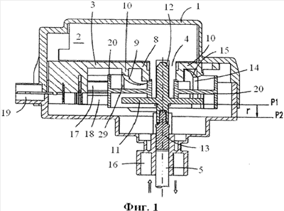 В корпусе 1 имеется цилиндрический элемент 16 (со стороны, противоположной двигателю), который соединяется со штоком 5 клапана и взаимодействует с электрическим переключающим устройством, включающим прерыватели 17 и 18, которые предназначены для запуска/остановки двигателя 2 каждый раз, когда шпиндель поворачивается на одну четверть окружности. Кроме того, в корпусе 1 выполнен внешний электрический соединительный разъем 19.