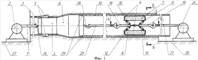 На фиг.1 показано предлагаемое устройство для бестраншейной замены трубопроводов (продольное сечение); на фиг.2 – разрез А-А на фиг.1; на фиг.3 – разрез Б-Б на фиг.1; на фиг.4 – разрез В-В на фиг 2.