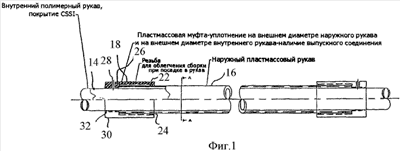 На каждом конце рукава 16 предусмотрена муфта 18, имеющая первый конец 22, который покрывает внешнюю поверхность рукава 16. На первом конце 22 может быть установлено уплотнение 24 (представляющее собой, например, уплотнительное кольцо круглого поперечного сечения), чтобы предотвратить выход текучей среды через муфту 18 на первом конце 22. Муфта 18 включает в себя буртик 26, который служит упором, ограничивая глубину вставления рукава 16 в муфту 18. Буртик 26 оканчивается, не вступая в контакт с рубашкой 14, обеспечивая проход к выпускному отверстию 28.