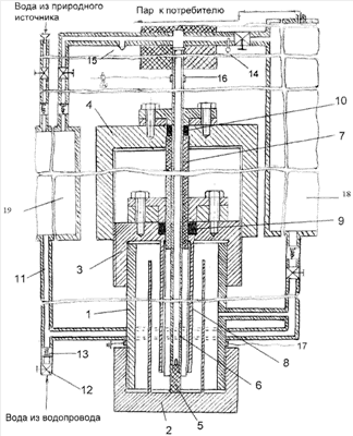 Устройство парогенератора содержит корпус 1, который имеет цилиндрическую форму и выполняется из алюминия, днище 2 и крышку 3, связанные с корпусом 1 посредством резьбовых соединений. На крышке 3 корпуса посредством резьбового соединения с возможностью перемещения по крышке установлен поводок 4. На днище 2 в средней его части установлен керамический подпятник 5, с которым взаимодействует центральный трубчатый электрод 6, выполненный из меди. Электрод 6 на части своей поверхности заключен в подвижную изолирующую оболочку 7, выполненную из фарфора и установленную с возможностью перемещения посредством поводка 4 вдоль центрального трубчатого электрода 6 и внутри металлической трубы 8, выполненной за одно целое с крышкой корпуса. Герметичность устройства обеспечивается с помощью сальников 9 и 10, установленных соответственно на крышке корпуса и поводке, сальник 9 при этом выполняется из алюминия, а сальник 10 из стеклотекстолита. Сальник 9 к тому же выполняет функцию направляющего элемента для изолирующей оболочки 7 при ее перемещении. Подача природной или водопроводной воды в корпус парогенератора осуществляется по трубопроводу 11, снабженного электрическими вентилями 12 и обратными клапанами 13. Магистраль отвода пара снабжена предохранительным клапаном 14 для быстрого сброса пара, реле давления 15 для контроля давления в магистрали и паровлагоотделителем для регулирования параметров подаваемого потребителям пара. К трубчатому центральному электроду 6 подведен токоввод 16 для подключения фазового провода, аналогичный токоввод 17 закреплен на корпусе парогенератора для подключения нулевого провода заземления. Позицией 18 обозначен влагоотделитель, позицией 19 обозначен резервуар для природной и водопроводной воды.