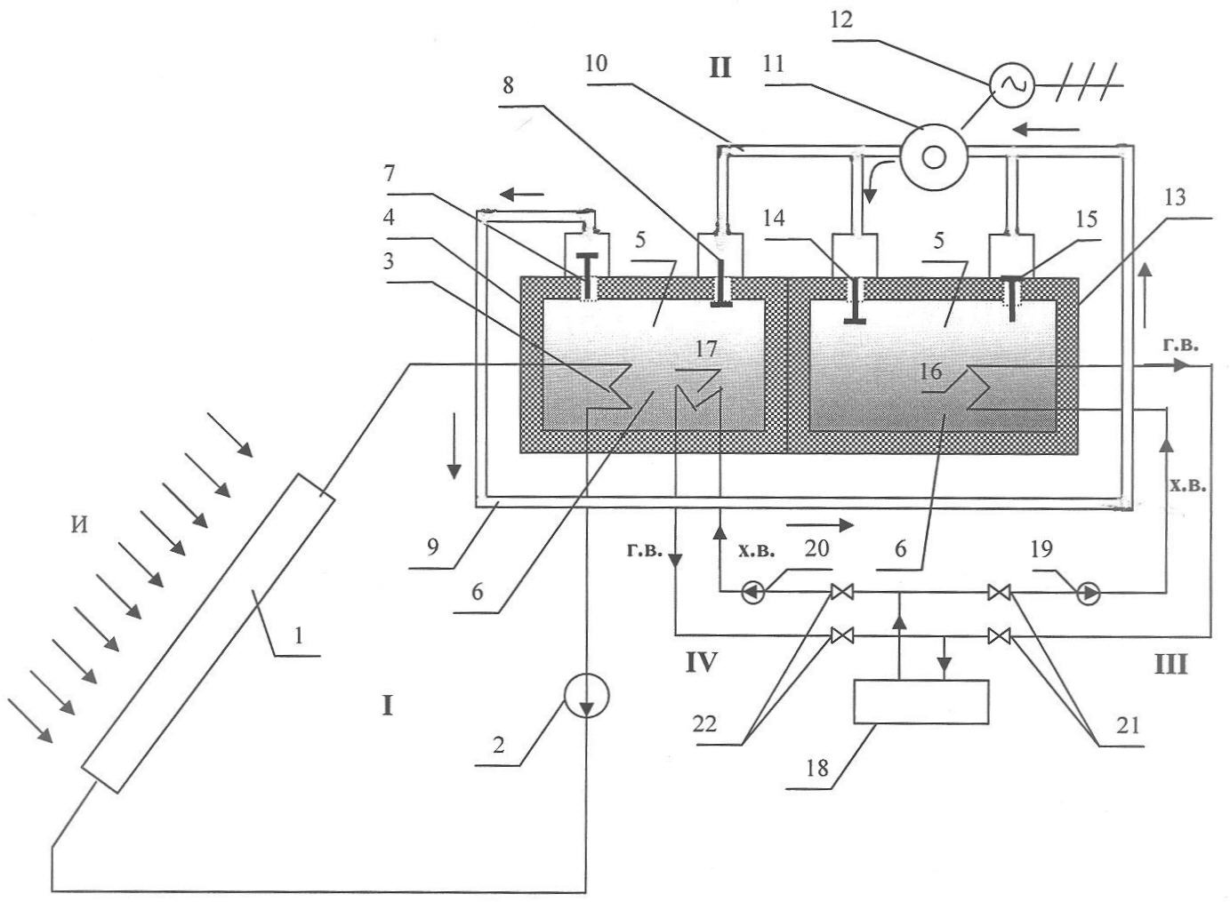 Она содержит I контур, где теплоносителем является вода, состоящий из солнечного коллектора 1, питательного насоса 2 и теплообменника 3, расположенного в герметичном сосуде 4 с теплоизоляционными стенками, заполненном термочувствительным газообразным рабочим телом 5 II контура, например аммиаком, и его жидким сорбентом 6, например водным раствором аммиака. Герметичный сосуд 4 соединен через напорный 7 и всасывающий 8 клапаны соответственно с напорным 9 и всасывающим 10 трубопроводами II контура. На напорном трубопроводе 9 размещена турбина 11, соединенная с генератором 12, и параллельно с ней – второй герметичный сосуд 13 с теплоизоляционными стенками. Герметичный сосуд 13 соединен с всасывающим трубопроводом 10 через входной обратный клапан 14, а с напорным трубопроводом 9 – через выходной обратный клапан 15. Второй герметичный сосуд 13 с теплоизоляционными стенками также частично заполнен жидким сорбентом 6, например водным раствором аммиака, и термочувствительным газообразным рабочим телом 5, например аммиаком, и служит аккумулятором энергии. Во втором сосуде 13 расположен теплообменник 16 III контура, в первом – теплообменник 17 IV контура, соединенные с потребителем тепловой энергии 18 питательными насосами 19 и 20 через вентили 21 и 22 соответственно III и IV контуров.