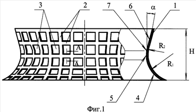 В ходе проведенного исследования работы диффузоров вентиляторных градирен была разработана такая конструкция ребер жесткости, которая позволила получить оптимальное соотношение между весом изделия и его жесткостью. Выполнение ребер пустотелыми и одновременно с трапецеидальным поперечным сечением позволило, с одной стороны, снизить вес изделия, а, с другой стороны, создать жесткую в поперечном направлении относительно ребра конструкцию. На это же направлено выполнение сочетания вертикальных и горизонтальных ребер жесткости с образованием между ребрами квадратных в поперечном сечении ячеек, что позволяет добиться практически одинаковой жесткости изделия как в поперечном, так и в продольном направлении. Вторая задача, которая решена в данном изделии, – добиться как можно более низкого аэродинамического сопротивления протекающему через диффузор потоку воздуха. Этого удалось добиться сочетанием сужающейся и расширяющейся по ходу потока частей диффузора, для чего диффузор имеет следующие параметры: радиус дуги окружности R1 конфузорной части обечайки составляет 0,6-0,8 от высоты обечайки, радиус дуги окружности R2 между цилиндрической и конической образующими поверхности обечайки составляет 0,7-0,9 от высоты обечайки, а угол наклона образующей конической поверхности обечайки к вертикальной оси обечайки составляет 10-20°, при этом конфузорно-диффузорная обечайка диффузора выполнена в виде тела вращения, образующая поверхности конфузорной (сужающейся по ходу потока) части обечайки образована дугой окружности, плавно сопряженной с образующей цилиндрической поверхности, а диффузорная (расширяющаяся по ходу потока) часть обечайки выполнена конической и образующая конической поверхности плавно сопряжена посредством дуги окружности с образующей цилиндрической поверхности.