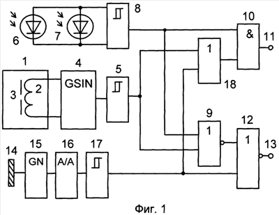 Устройство содержит (см. фиг.1) индуктивный чувствительный элемент 1, выполненный в виде катушки индуктивности 2, помещенной со стороны открытого торца чашки ферритового сердечника 3 с центральным отверстием в ее кольцевом пазу, высокочастотный генератор электрических колебаний 4, выполненный, например, по схеме индуктивной трехточки, причем выходы индуктивного чувствительного элемента 1 подключены к цепям его колебательного контура, первый пороговый элемент 5, выполненный, например, по схеме триггера Шмитта, вход которого подключен к выходу высокочастотного генератора электрических колебаний 4, первый и второй инфракрасные фотоприемники 6, 7, включенные между собой параллельно, формирователь импульсов 8, выполненный, например, по схеме триггера Шмитта, ко входу которого подключены выходы инфракрасных фотоприемников 6, 7, логический элемент 2ИЛИ-НЕ 9, первый вход которого соединен с выходом первого порогового элемента 5, второй вход – с выходом формирователя импульсов 8, первый логический элемент 2И 10, первый вход которого подключен к выходу формирователя импульсов 8, первую выходную клемму 11, соединенную с выходом первого логического элемента 10 и являющуюся первым выходом устройства, второй логический элемент 2И 12, первый вход которого соединен с выходом логического элемента 2ИЛИ- НЕ 9, вторую выходную клемму 13, подключенную к выходу второго логического элемента 2И 12 и являющуюся вторым выходом устройства, емкостной чувствительный элемент 14, последовательно включенные мультивибратор 15, к входу которого подключен емкостной чувствительный элемент 14, выполненный, например, по схеме симметричного автогенератора прямоугольных импульсов на основе операционного усилителя (см. книгу “Шило В.Л. Линейные интегральные схемы в радиоэлектронной аппаратуре, – М.: “Сов. радио”, 1974, с.175, рис.4.42, а), детектор 16, выполненный, например, по схеме диодного пассивного преобразователя амплитудных значений переменного напряжения в постоянное с последовательным включением выпрямительного диода с выходной нагрузкой в виде параллельной RC – цепи (см. книгу “Волгин Л.И. Измерительные преобразователи переменного напряжения в постоянное. М.: “Сов. радио”, 1977, с.174, рис.4.9, б), второй пороговый элемент 17, выполненный, например, по схеме триггера Шмитта, выход которого соединен со вторым входом второго логического элемента 2И 12, а также логический элемент 2ИЛИ 18, первый вход которого соединен с выходом первого порогового элемента 5, второй вход – с выходом второго порогового элемента 17, выход – со вторым входом первого логического элемента 10.