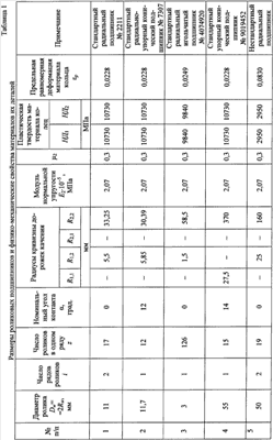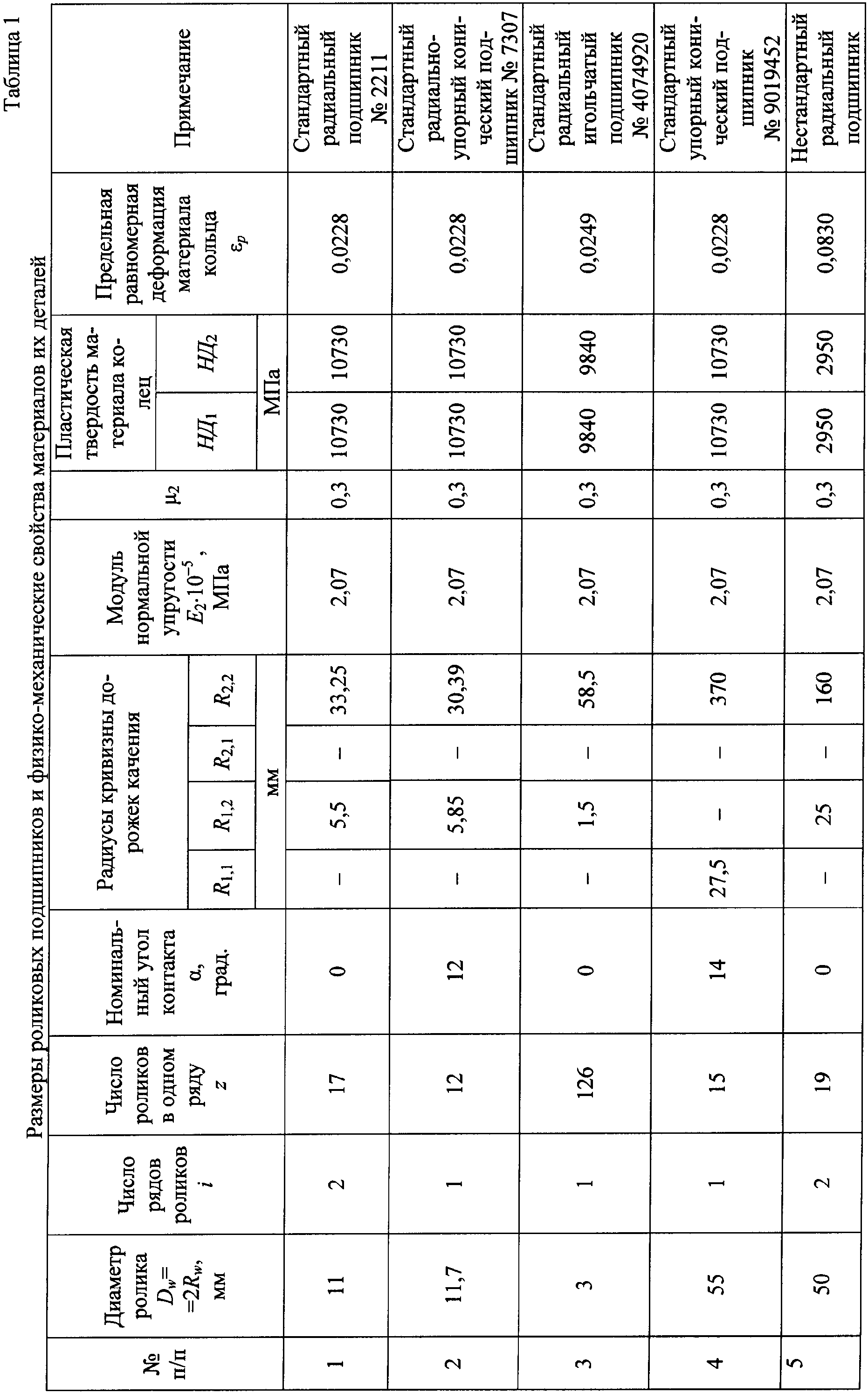 Измеряют число рядов i и число z роликов в одном ряду. Измеряют номинальный угол С учетом Рдоп определяют базовую статическую грузоподъемность роликового подшипника качения по формулам (5) и (6) – для радиальных и радиально-упорных подшипников C0=0,2Рдопizcos – для упорных и упорно-радиальных подшипников C0=0,2Рдопizsin Пример. Проведена экспериментальная проверка предложенного способа. Определение базовой статической грузоподъемности роликового подшипника качения выполнили как для стандартных подшипников качения (которые согласно ГОСТ 18854-94 изготовлены из высококачественной, закаленной стали в условиях хорошо налаженного производства, имеют обычную конструкцию и формы контактных поверхностей), так и для подшипников, твердость материала и формы контактных поверхностей которых отличаются от стандартных. В таблице 1 приведены основные размеры и физико-механические свойства ряда исследованных стандартных и нестандартных подшипников. В таблице 2 представлены значения базовой статической грузоподъемности различных роликовых подшипников качения. Экспериментальные значения С0,э определяли с помощью прибора для измерения контактных деформаций, конструкция которого аналогична конструкции прибора ПКД-5, описанного в книге (Демкина Н.Б., Рыжова Э.В. «Качество поверхности и контакт деталей машин». – М.: Машиностроение, 1981. – 244 с, на с.214, рис.5.2). При этом исходили из того, что согласно ГОСТ 18854-94 (см. стр.3) базовая статическая грузоподъемность – это такая нагрузка на подшипник, при которой общая остаточная деформация в центре контакта наиболее нагруженного ролика с дорожкой качения приблизительно равна 0,0001 диаметра тела качения (то есть равна 0,0001 Dw). Величину остаточной деформации в указанном приборе измеряли оптикатором с ценой деления 0,2 мкм. Таким образом, экспериментально находили наибольшую допускаемую нагрузку Рдоп на ролик, при которой величина остаточной деформации составляет 0,0001 его диаметра; затем по формуле (5) или (6) вычисляли С0,э. Как видно из таблицы 2, погрешность определения базовой статической грузоподъемности роликового подшипника качения по сравнению с экспериментом составляет: – у предлагаемого способа не более 3,6-12% для стандартных радиальных и радиально-упорных подшипников, 0,89-1,64% для стандартных упорно-радиальных и упорных подшипников; для нестандартных радиальных и радиально-упорных подшипников погрешность предлагаемого способа не превышает 4,3%, а для нестандартных упорно-радиальных и упорных подшипников и для нестандартных подшипников не превышает 3,0%; – у способа-прототипа погрешность для стандартных подшипников указанных типов составляет 0,89-9,8%, а для нестандартных подшипников достигает расчета по способу-прототипу, завышает статическую грузоподъемность подшипника от 2,33 раза (см. подшипник № 7 в табл. 2) до 90,8 раз (см. подшипник № 10 в табл. 2). При этом, как видно из таблицы 2, погрешность способа-прототипа особенно существенно возрастает с уменьшением твердости материала колец подшипника. Таким образом, способ-прототип не пригоден для определения статической грузоподъемности роликовых подшипников с параметрами, отличными от стандартных подшипников. Использование предлагаемого способа по сравнению с известными обеспечивает следующие преимущества. Способ обладает достаточно высокой точностью: пог