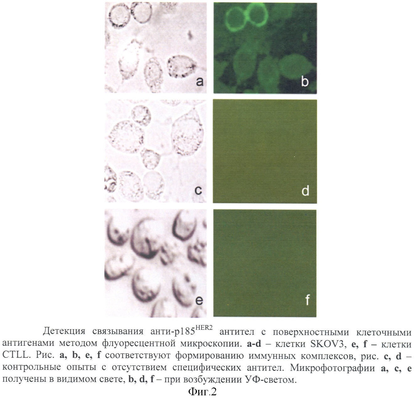Пример 2. Флуоресцентно-микроскопическая детекция белка-онкомаркера p185HER2 на поверхности клеток аденокарциномы яичника с помощью рекомбинантных конъюгатов барстара с «улучшенным» зеленым флуоресцентным белком (EGFP) и барназы с мини-антителами.