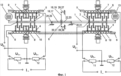 Компаратор имеет поперечную горизонтальную балку 1, по краям которой укреплены подвижные сдвоенные цилиндрические электроды 2 двух бинантных электростатических преобразователей мощности в виде многокамерных цилиндрических конденсаторов, неподвижные электроды 3 и 4 которых, жестко связанные с основанием компаратора 5 и 6, снабжены дополнительными электродами 7 и 8, хвостовики которых укреплены в центре неподвижных электродов 3 и 4 с возможностью плавного регулирования емкости конденсаторов, образованной электродами 2, 3, 4, 7, 8, изоляторами 9, 10, на которых укреплены неподвижные электроды 3 и 4. Электростатические экраны к электродам 3, 4, токоподводы к электродам 2 и изоляторы, разделяющие поперечную горизонтальную балку 1 и сдвоенные подвижные электроды 2, на фиг.1 не показаны. Неподвижные электроды 3, 4 подключены к концам шунтов 11, 12, а цепь измеряемого напряжения U2 (U2-) подключена к сдвоенному подвижному электроду 2 и к средней точке шунтов 11, 12.