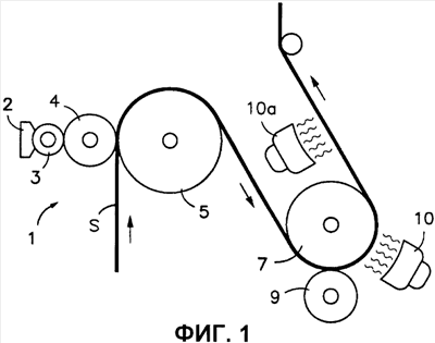 Фиг.1 – схематическое и частичное изображение печатной машины, соответствующей выполнению способа согласно настоящему изобретению;