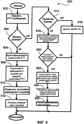 На Фиг.6 показана блок-схема 600 последовательности операций для сервера PTT. Сервер PTT принимает связанные с PTT сообщения от всех абонентов PTT. Когда сервер PTT принимает PTT-сообщение от пользователя, этап 602, он проверяет, является ли оно запросом вызова PTT, этап 604. Если PTT-сообщение является запросом вызова, PTT-сервер идентифицирует участников PTT в составе группы PTT, которой принадлежит пользователь, этап 606. После идентификации участников PTT сервер PTT формирует сообщение извещения о вызове для каждого участника PTT, этап 608. Сервер PTT специальным образом помечает заголовок сообщения извещения о вызове PTT, этап 610, с тем, чтобы сообщение извещения о вызове PTT было обработано базовой станцией иным образом. После того, как сообщение извещения о вызове PTT сформировано с наличием специального заголовка, сервер PTT посылает его на базовую станцию, этап 612, и базовая станция затем пошлет сообщение извещения о вызове PTT участникам PTT.