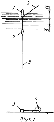 Настройка и работа снасти происходят следующим образом. Антенна 1 изготавливается из материала, плотность (уд. вес) которого меньше единицы, грузоподъемность и объем – минимальные. Однако она самодостаточна, чтобы быть на плаву и обеспечивать грузоподъемность надводной части антенны, вес лески от поплавка до антенны, частично от антенны к удилищу, а также некоторые непредвиденные динамические нагрузки. Кроме этого, надводная часть антенны имеет минимальный объем, чтобы при погружении ее в воду рыба не почувствовала сопротивления. Но, в то же время, она хорошо видима для рыболова. Один из вариантов изображен на фиг.2 и 3. Поплавок 2 может быть каплеобразный, яйцеобразный, любой формы, скользящий или неподвижный. Главное – он находится вдали от антенны в спокойном слое воды. В целом антенна 1, поплавок 2, грузило 3 и крючок с насадкой 4 находятся почти во взвешенном состоянии. Однако грузило 3 и крючок с насадкой 4 обязательно превышают грузоподъемность поплавка 2 и антенны 1. Это основная настройка (при рыбалке с дна). При рыбалке “с полводы” на антенну 1 (фиг.2) насаживают компенсационное колечко 7. Его грузоподъемность очень незначительная, но достаточная, чтобы оторвать грузило 3 и крючок с насадкой 4 от дна и удерживать их на нужном расстоянии от него. При подъеме рыбой насадки 4 и грузила 3 поплавок 2 поднимается, ослабляя натяжение лески на участке от поплавка до антенны, в результате чего антенна поднимается. При потяге насадки вниз или в сторону антенна исчезает под водой.