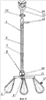 Подвеска для крепления тушек птицы во время их охлаждения состоит из вертикального стержня 1, имеющего цапфу 2 и направляющие кольца 3. В цапфу 2 вставлена с возможностью вращения ось 4, на которой жестко закреплен упор 5 и два ряда рожков 6. Рожки 6, на которые насаживаются тушки 7, могут иметь различную форму: в виде петель, в виде стержня с кольцом или шаром на конце и т.п. Ряды рожков расположены со смещением центра тяжести относительно их общей оси 4 (см. фиг.1, где l1>l2). На стержень 1 свободно посажено кольцо 8, жестко связанное с тягой 9, проходящей через направляющие 3. На нижнем конце тяги 9 жестко установлен фиксатор 10 с пазом 11, в который входит упор 5. Кольцо 8 может быть жестко связано с тягой 9 в любом месте (внизу, в середине, вверху). В верхней части тяга 9 имеет палец 12 в виде отогнутого конца. Подвеска подвешивается к каретке 13 подвесного конвейера 14 с помощью болтового соединения 15. На конвейере 14 укреплены вдоль линии движения подвесок копир 16 для сброса тушек с подвесок и копиры 17 и 18 для возвращения рожков 6 в исходное положение. При охлаждении крупных тушек птицы (массой более 1.5 кг) подвески выполняются с разной длиной стержня (разница в длине равна длине обрабатываемой тушки). В этом случае подвески устанавливаются в каретки 13 конвейера 14, чередуясь: длинная – короткая. Тушки при этом будут располагаться на разной высоте и не будут касаться друг друга.