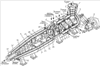 Затем взбитая смесь компонентов последовательно перемещается во вторую камеру 8 фризера. Одновременно через патрубок 23 в общий двутельный корпус 22 второй 8 и третьей 9 камеры подается жидкий аммиак (или другой какой-либо хладоагент, например фреон R502), который охлаждает внутреннюю поверхность корпуса 1 этих камер и отводится через патрубок 24. В общем двутельном корпусе 22 второй 8 и третьей 9 камеры, который является испарителем, кипит жидкий аммиак. Смесь охлаждается и постоянно перемешивается ножеобразными пластинами 25 во второй камере 8 и витками шнека 26 переменного шага и диаметра в третьей камере 9.
