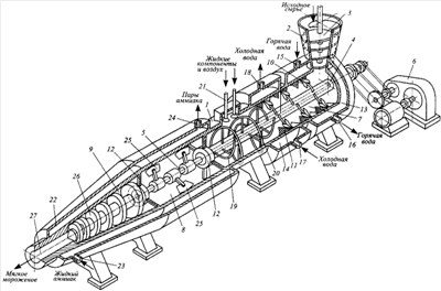 Одновременно через патрубок 15 в первую часть 13 двутельного корпуса первой камеры 7 подается горячая вода, которая нагревает внутреннюю поверхность корпуса 1 и отводится через патрубок 16.