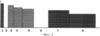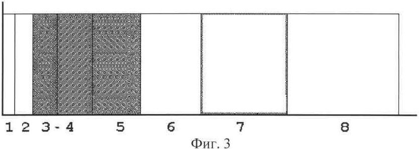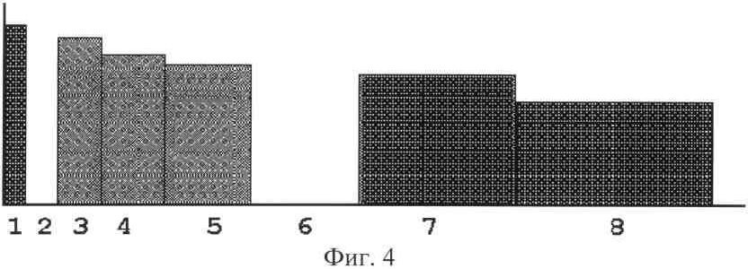 На фиг.3 представлены полосы белого шума 3-4-5 с равной спектральной плотностью, а на фиг.4 – полосы одинаковые по уровню звукового давления. При одинаковых УЗД полос можно создавать их любые комбинации. На фиг.4 комбинация полос 1-7-8 (более темная). Она тоже использовалась в эксперименте.