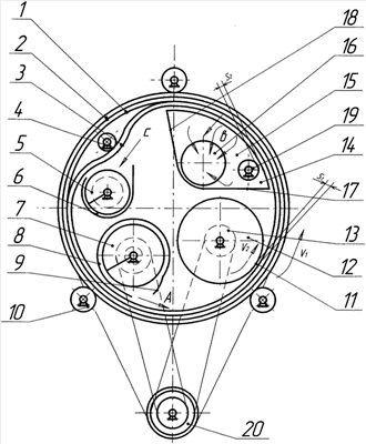 Жесткий перфорированный барабан 1, опирающийся на ролики 10 и приводимый во вращение от механизма привода 20, в свою очередь, приводит во вращение вложенный внутрь него гибкий рабочий орган 3. Совместное вращение барабана 1 и гибкого рабочего органа 3 (за исключением участка обратной кривизны на нем) обеспечивается силами трения между ними, вызываемыми их упругим взаимодействием и в большой степени центробежными силами инерции, действующими на гибкий рабочий орган на его цилиндрической поверхности радиуса R.
