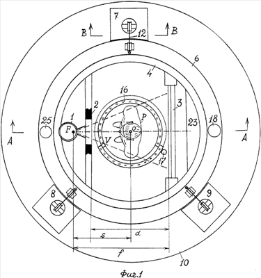 Каретка 4 может равномерно вращаться вокруг кабины пациента 16 в обойме 6 в пределах от 0° до 360° при работе редуцированного электродвигателя 18. Вращение каретки 4 осуществляется вокруг вертикальной оси, проходящей через центр кабины пациента и удаленной от фокуса рентгеновского излучателя на величину , где f – фокусное расстояние, d – расстояние от щели коллиматора до линейного приемника вдоль центрального рентгеновского луча. Уравнение (1) получено с учетом качественных критериев формирования рентгеновского изображения и обеспечивает оптимальные условия получения поперечного томографического изображения при положении пациента Р в центре кабины 16.