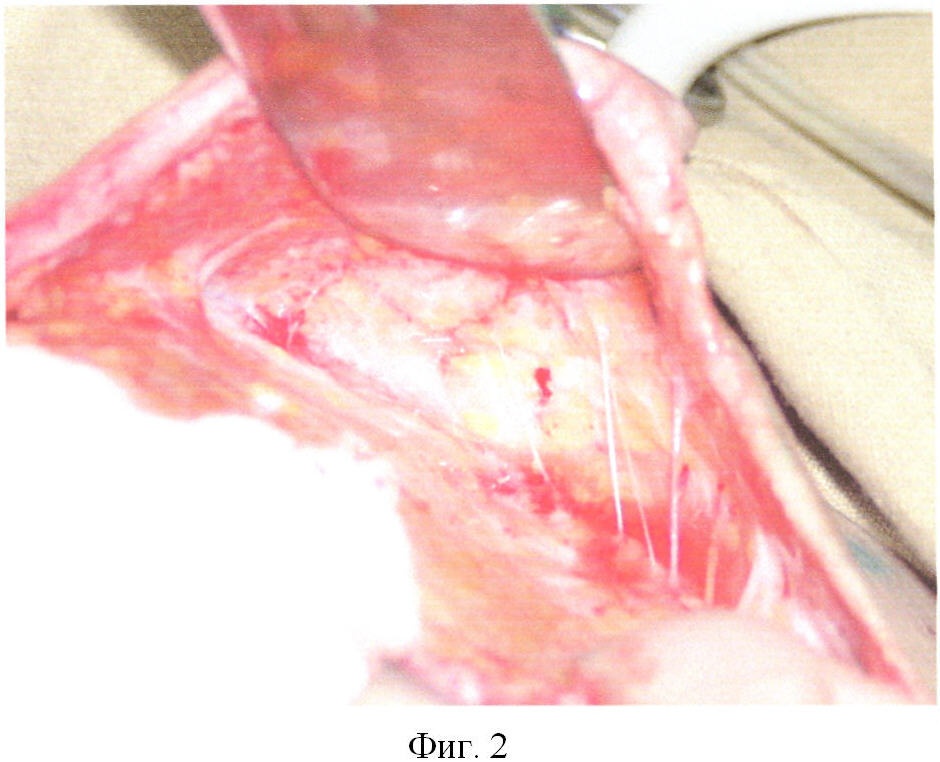 Фиг.2. Кожно-жировой лоскут и рубцово измененные ткани мобилизованы. Перфорантные артериальные, венозные и лимфатические сосуды выделены.
