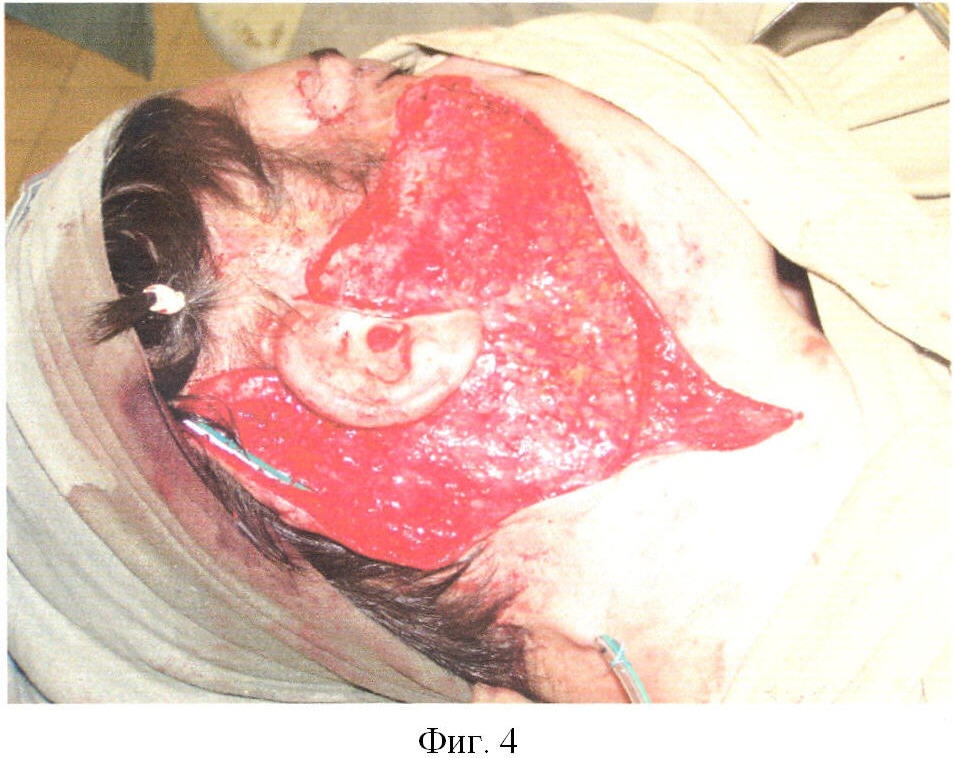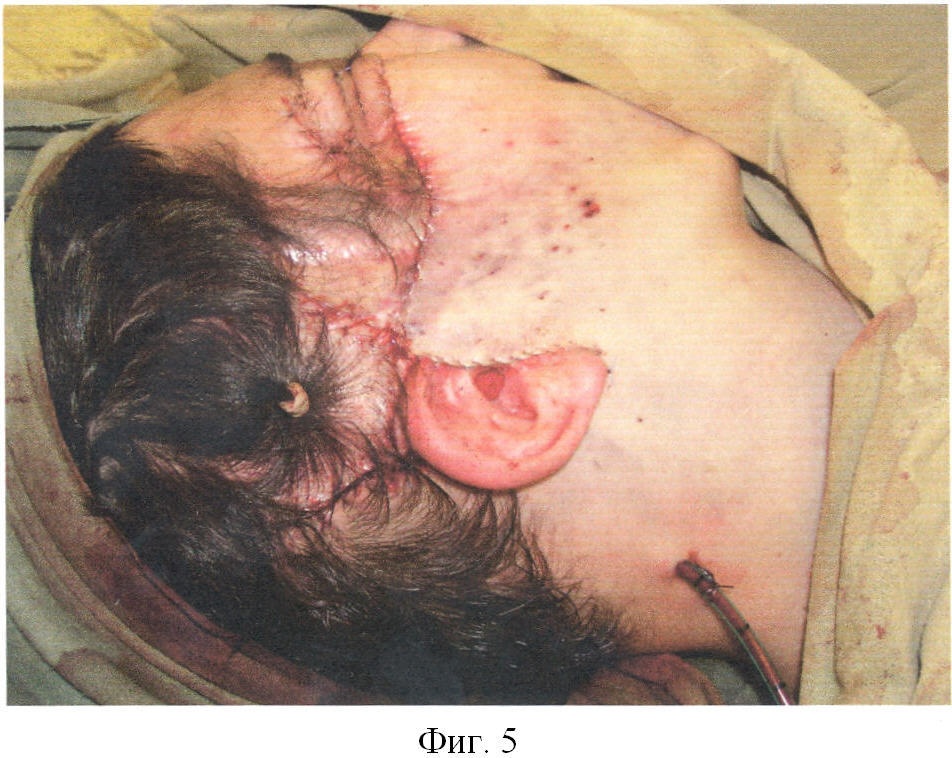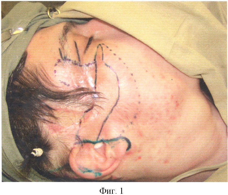 Фиг.1. Послеожоговая деформация лица. Предоперационная разметка зоны рубцового дефекта.