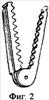 Среди элементов герметизации обработанной культи бронха известна (Богуш Л.К., Кагаловский Г.М. Новый способ закрытия культи бронха при резекции легкого. – Хирургия, 1961, 3, с.67-69) клемма, которая выполнена из вываренной губчатой кости крупного рогатого скота и содержит (см. фиг.2) две шарнирно соединенные бранши, на обжимающих поверхностях которых выполнены конгруэнтные зубцы призматической формы, а на противоположных поверхностях, на концах браншей, выполнены пазы для размещения лигатуры, стягивающей бранши при установке клеммы на культю бронха.