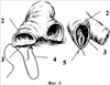 На фиг.5 показана стадия взятия бронха на бронхофиксатор при осуществлении заявляемого способа, где 1 – бронхофиксатор, 2 – хрящевое полукольцо и 3 – мембранозная часть.