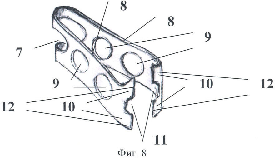 На фиг.8 показан внешний вид заявляемой клипсы для герметизации культи бронха, которая имеет форму, соответствующую форме клипсы после ее установки и фиксации на культе бронха, где 7 – прорезь, 8 – бранша, 9 – отверстие бранши, 10 – выступ, 11 – выемка и 12 – фиксирующая кромка.