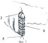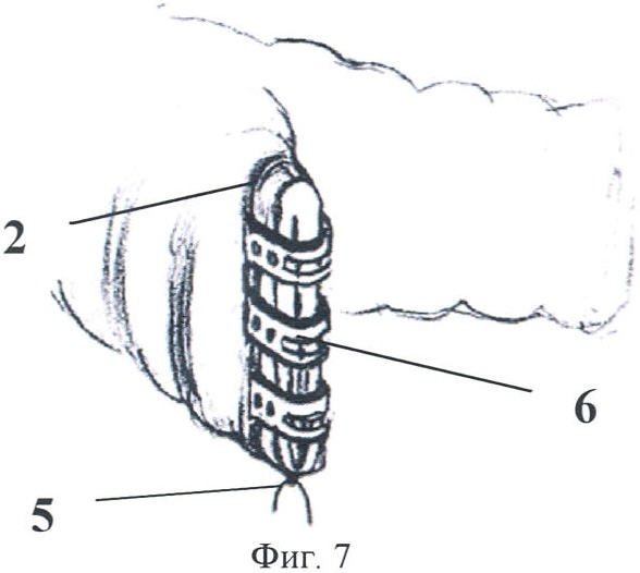 Далее по линии пересечения бронха (на уровне второго или третьего хрящевых полуколец 2) делают надрез бронха скальпелем через межкольцевую связку. Через образовавшееся отверстие слизистую бронха обрабатывают раствором азотнокислого серебра или 5-процентным раствором йода. Бронх подготовлен к герметизации (фиг.5). Герметизацию бронха осуществляют с помощью заявляемой клипсы 6.