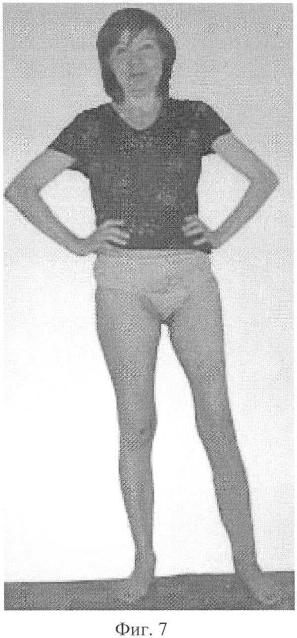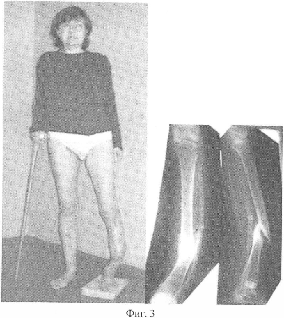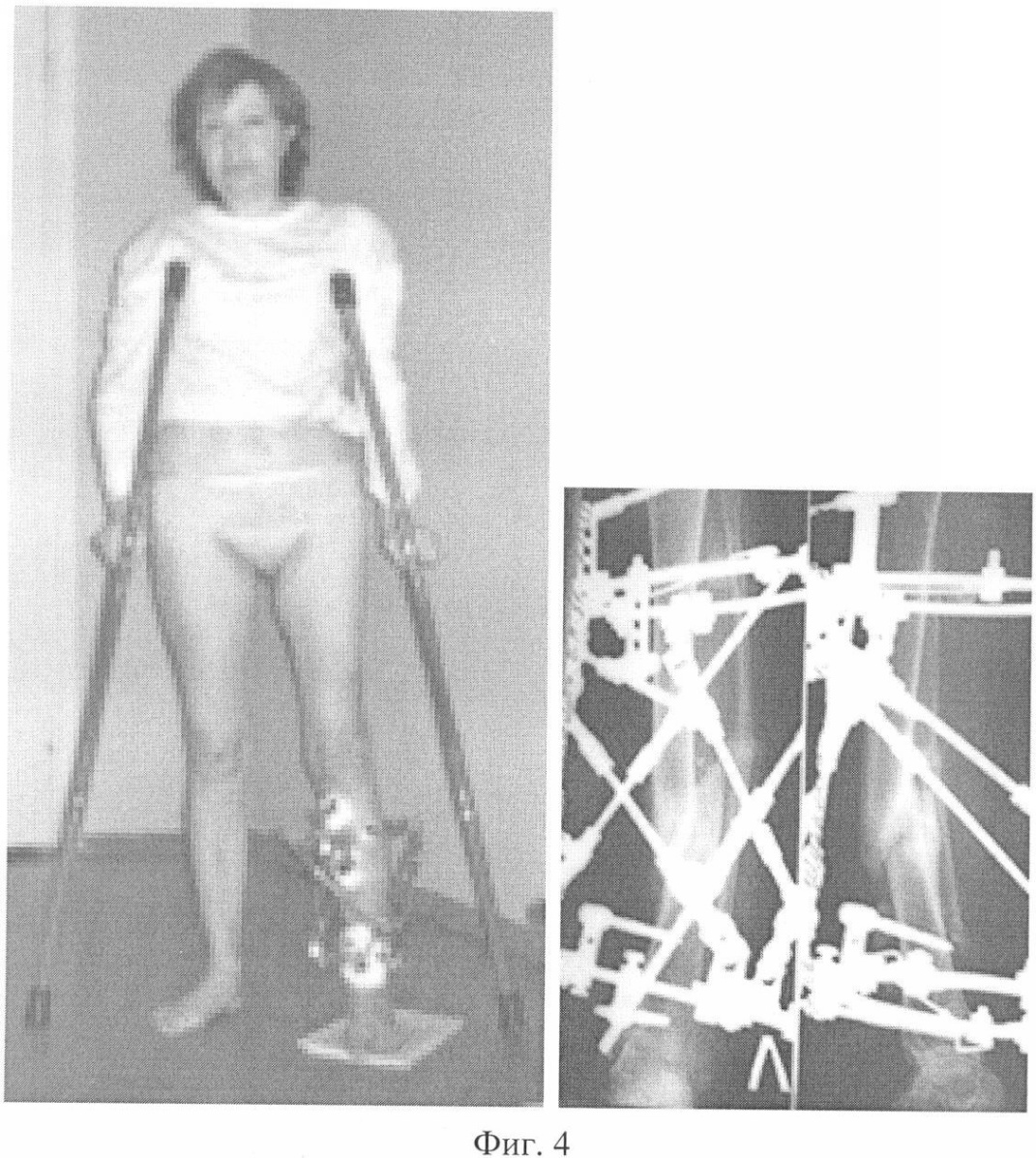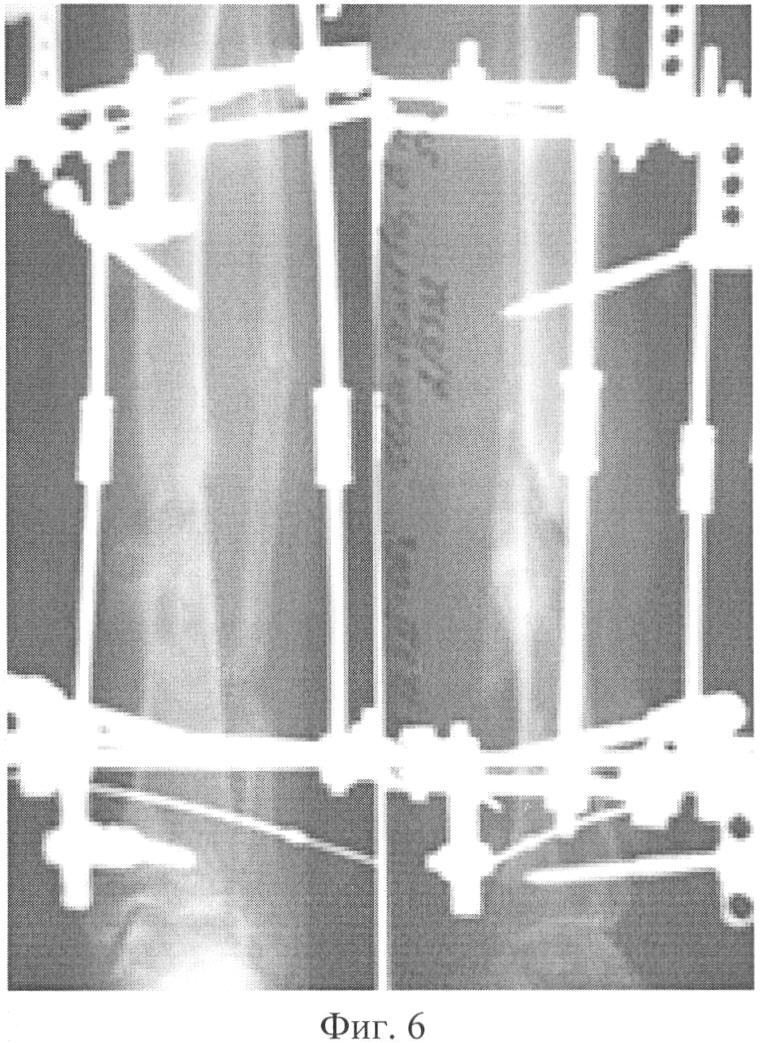 Больная Ш., 52 лет, поступила на 2 отд. РНИИТО 18.05.2006 с диагнозом: Ложный сустав средней трети левой большеберцовой кости. Рентгенологически отмечалась антекурвационная деформация с углом 24 град. и варусная деформация с углом 27 град. (Фиг.3). 24.05.2006 выполнена операция: Остеотомия левой малоберцовой кости в н/3, наложение аппарата Соломина-Утехина-Виленского (Фиг.4). С 29.05.2006 начато устранение деформации. Деформация устранена за 12 суток (Фиг.5). После устранения деформации система из 6-ти телескопических штанг заменена на штанги из набора аппарата Илизарова. Перелом сросся (Фиг.6). Период фиксации составил 130 дней; аппарат демонтирован (Фиг.7).